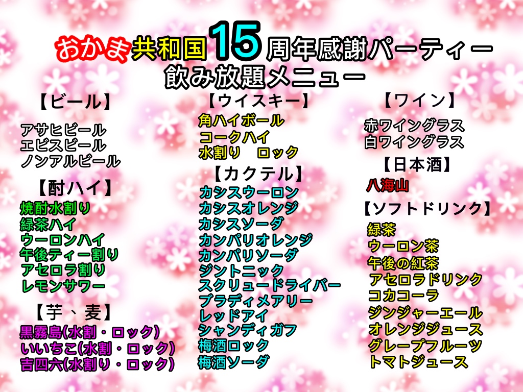 今宵は飲んで食べて歌って、盛り上がってください。ビールもカクテルも飲み放題です。15年の感謝を込めて、スタッフ一同心よりお待ちしております。