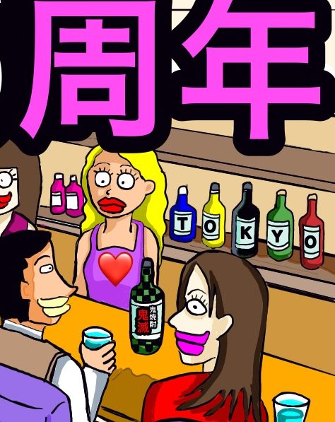 わたくし毎年周年のポスターを描いております。これは今年の2月に描いたもので現在もお店に貼ってありますが、休業中なのでお客様の目に留まる機会がないままです。ポスターのテーマは「マスクのない普段の状態に戻ることへの願い」という意味を込めて、歌ったり飲んだりしている絵にしました。一見なんてことのない普通の絵ですが、普通のことができなくなってしまった今年ならではのポスターです。よく見るとボトルが五輪のカラーになっていたり、鬼滅の刃の市松模様だったりと、2021年を象徴する小細工も見られます。