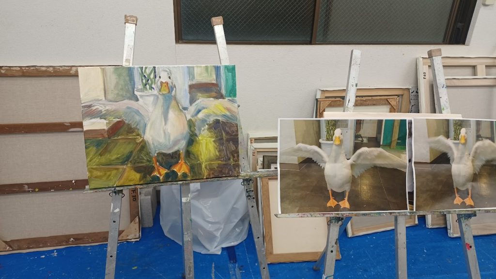 現在描いている絵。飛べないくせにばたつくアヒルが愛らしい。