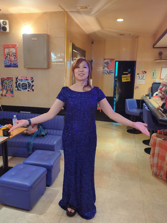 こちらは常連のお客様に用意してもらったスパンコールのドレスです。Dカップのヌーブラも着用して気合十分!