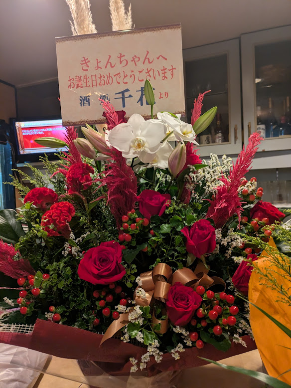酒処千花さんからです。薔薇が存在感ある、情熱的なアレンジです😀