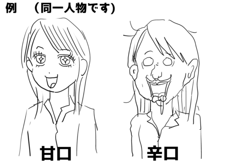 似顔絵は下の例のように、甘口と辛口のに2タイプで描き分けます。特徴を掴んで1、2分で完成させる。特技を生かしたサービスだっただけに、こちらとしても喜んでいただけて嬉しいです😀何故か辛口が好評😗