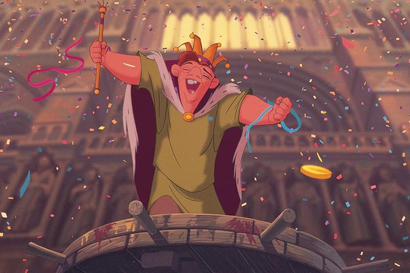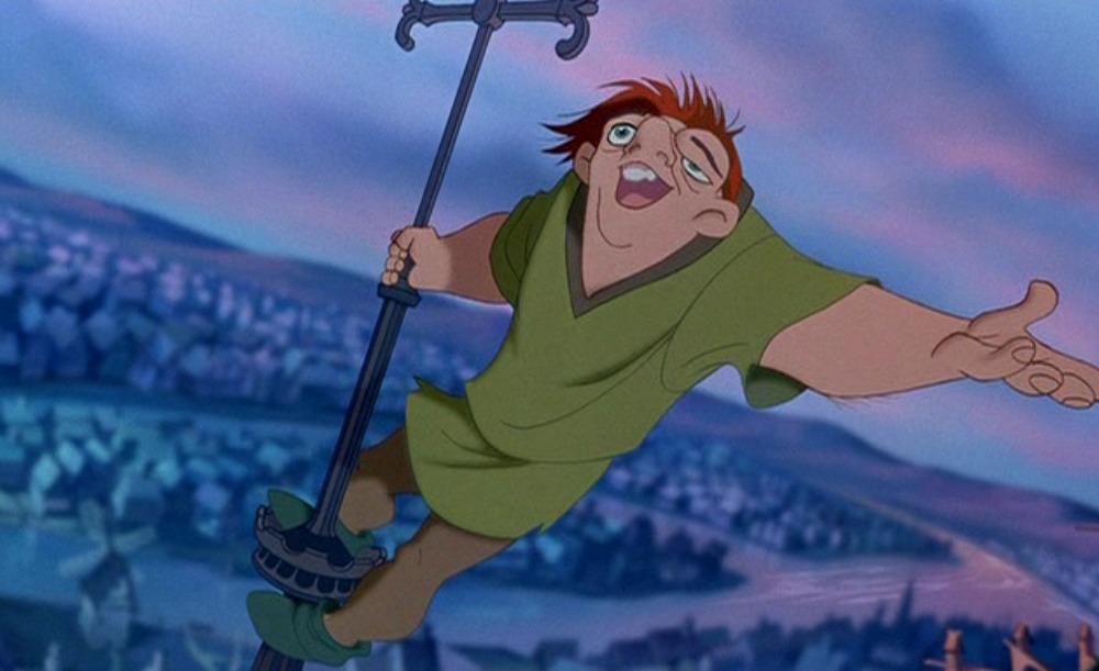 彼は醜い外見のせいで鐘楼に閉じ込められていて、外に出るのを夢見てました。ありがちなのですが見た目に反し、心優しく勇気のあるキャラクターです。また、「上げて落とす」というもっとも感情移入に効果的なシークエンスがあります。カジモドは念願の外出を果たすと上記の画像のように突然祭り上げられます。初めて出てきた外の世界に歓迎される気分で応えるのですが、なんと不細工コンテスト的なのもの(なんじゃそりゃ)に瞬間的に優勝しただけで、後にトマトを投げつけられ笑われてしまいます。キャラクターに感情移入させるには、「劣等感」や「怒り」、「悲しさ」らが効果覿面なのですが、まず最高な状態にさせてからどん底に落とすという。なかなかカジモドにとって辛い脚本構成です。ですが、この時点で我々、観客をカジモドの味方にしてしまい彼の今後の幸運を願ってしまうようになるのです。
