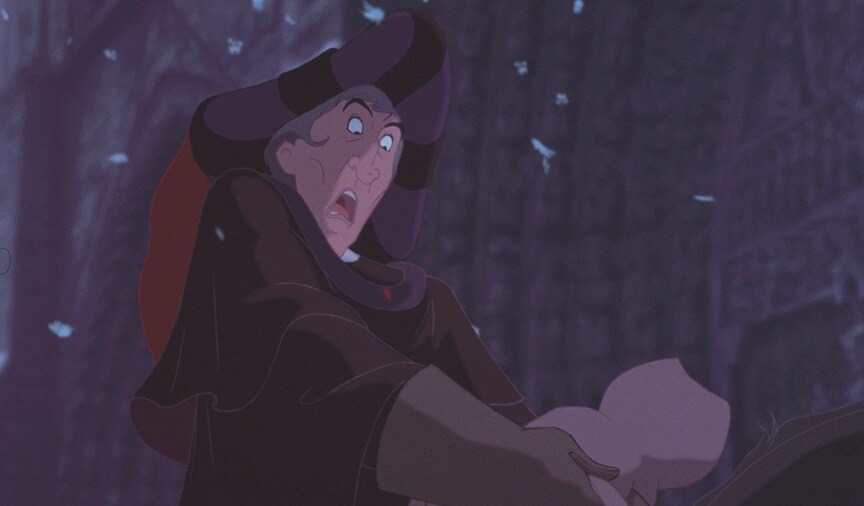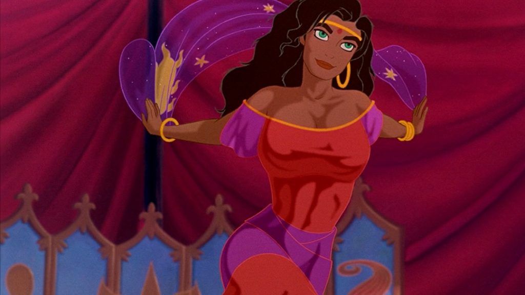 見てください!この当時のアニメーターの性欲パワーを注ぎ込んだであろう身体の描写を…!子供向けアニメーションにしてはさすがにやりすぎです。これまたありがちなのですがエスメラルダは、外見も良く、さらに中身もいいキャラクターです。移民であり差別される対象であるためか、カジモド相手にも差別なく接し、勇敢なキャラクターです。我々は先ほどのシークエンスで、カジモドに感情移入しているせいか優しく接してくれる彼女に対してまるで初恋気分のようなドキドキした気持ちなります。この子に用意された展開も良いのです。フィーバスという胡散臭いイケメン?が出てくるのですが中盤でエスメラルダとフィーバスはキスをして結ばれてしまいます。いくらカジモドを平等に見ようともイケメンと結ばれるこの展開は、カジモドという役柄に忖度や差別をせず、キャラクター性とリアリティを尊重する姿勢がうかがえます。