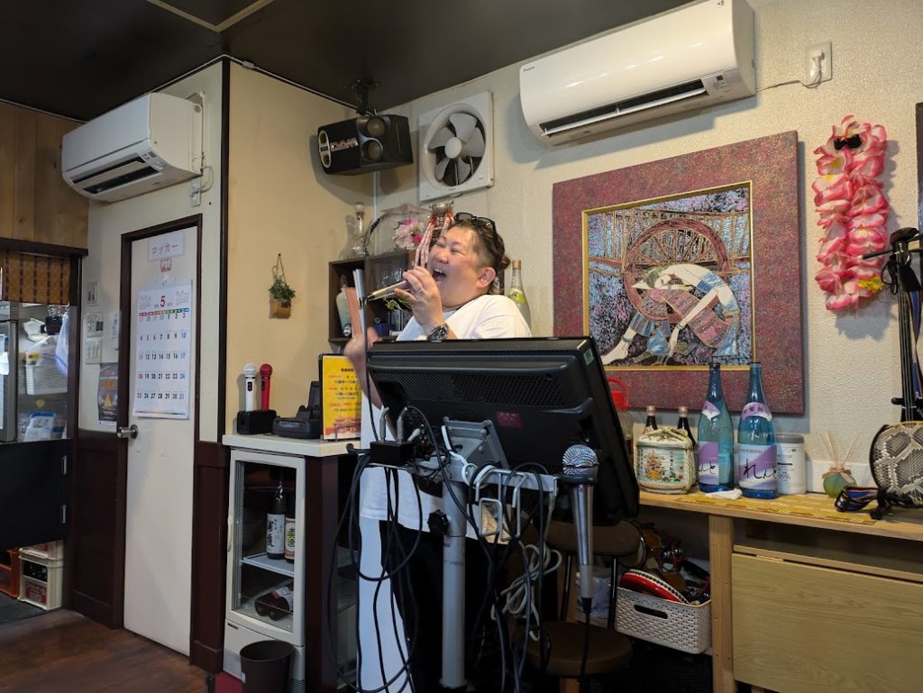 居酒屋ふくちゃんから少し離れた場所にある沖縄料理うりずんへ移動。ここはカラオケがあるので、この辺の方々は歌いたくなったらここへ来るそうだ。